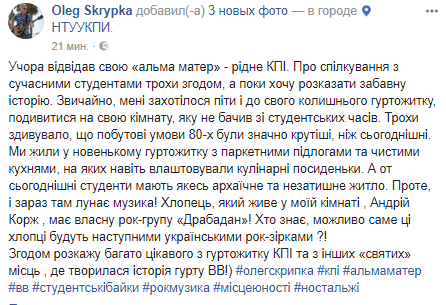 "Конечно, мне захотелось пойти и к своему бывшего общежитию, посмотреть на свою комнату, которую не видел со студенческих времен. Немного удивило, что бытовые условия 80-х были значительно круче, чем сегодняшние. Мы жили в новом общежитии с паркетными полами и чистыми кухнями, на которых даже устраивали кулинарные посиделки. А вот сегодняшние студенты имеют какое-то архаичное и неуютное жилище. Однако, и сейчас там звучит музыка! Парень, который живет в моей комнате, Андрей Корж, имеет собственную рок-группу "Драбадан"! Кто знает, возможно именно эти ребята будут следующими украинскими рок-звездами?!", - написал музыкант.
