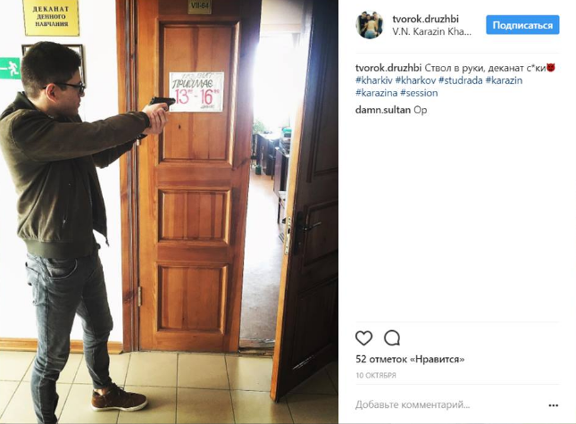 На его странице в Instagram можно найти и другие фото с оружием. Например, возле деканата на факультете иностранных языков Харьковского университета имени Каразина.