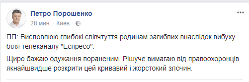 Петр Порошенко требует как можно быстрее закончить расследование взрыва в Киеве, в результате которого погибли двое правоохранителей, а нардеп Игорь Мосийчук и политолог Виталий Бала получили ранения. Об этом президент написал в Facebook.