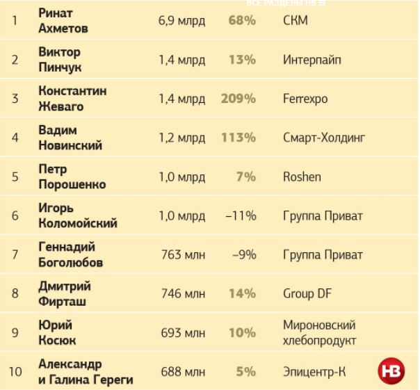 Первое место вновь занял бизнесмен Ринат Ахметов с состоянием в $6,9 млрд - оно выросло на 68% в сравнении с прошлым годом. На второй строчке - Виктор Пинчук ($1,4 млрд, +13%), на третьей - Константин Жеваго ($1,4 млрд, +209%).