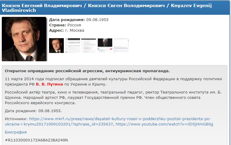 Известный российский актер театра и кино, народный артист РФ Евгений Князев попал в базу центра "Миротворец". Об этом свидетельствует соответствующая запись в чистилище "Миротворца".