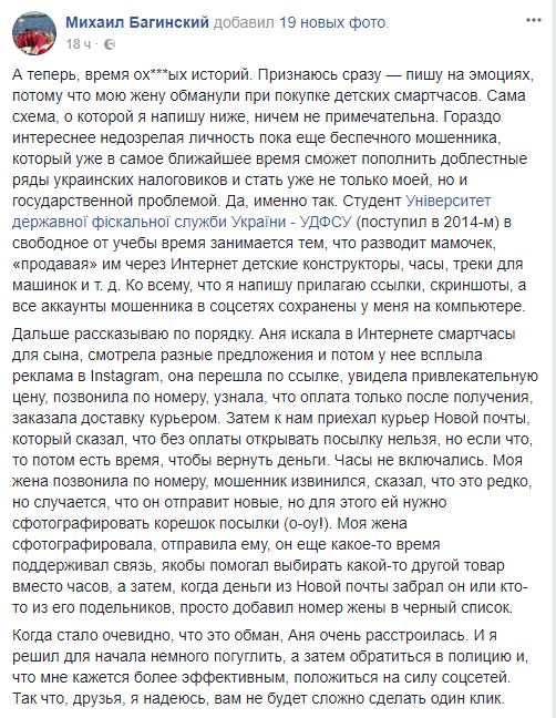 "Мою жену обманули при покупке детских смартчасов. Сама схема, о которой я напишу ниже, ничем не примечательна. Гораздо интереснее личность пока еще беспечного мошенника, который уже в самое ближайшее время сможет пополнить доблестные ряды украинских налоговиков и стать уже не только моей, но и государственной проблемой", - пишет Багинский.