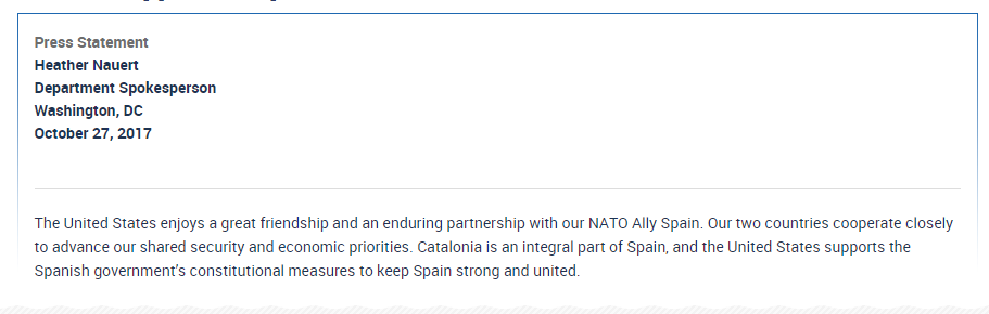 В США официально считают Каталонию неотъемлемой частью Испании и поддерживают конституционные меры испанских властей для сохранения страны.