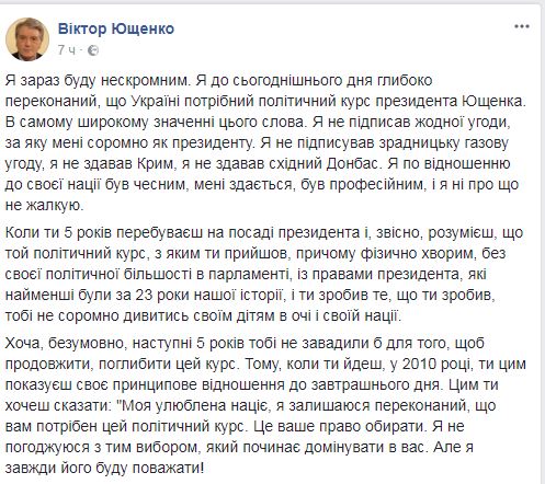 "Я сейчас буду нескромен. Я до сегодняшнего дня глубоко убежден, что Украине нужен политический курс президента Ющенко. В самом широком смысле этого слова, - написал он.