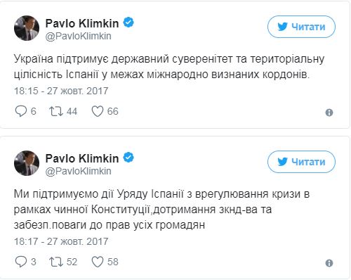 "Украина поддерживает государственный суверенитет и территориальную целостность Испании в пределах ее международно признанных границ. Мы поддерживаем действия Испанского правительства по урегулированию кризиса в соответствии с ее Конституцией, соблюдения закона и уважения прав всех граждан", - написал министр на своей странице.