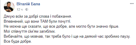 "Спасибо всем за добрые слова и пожелания. Уверен, что они ТАМ все слышат. Нельзя сказать, что все хорошо, но могло быть гораздо хуже. Мои соболезнования семьям погибших.