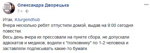 Вместе с тем исполнительный директор общественной организации Восток-SOS Александра Дворецкая написала на своей странице в Facebook, что вчера несколько задержанных в связи с уклонением от призыва отпустили домой после обыска в ночном клубе Киева Jugendhub. При этом им выдали повестки на 09:00 сегодняшнего дня.