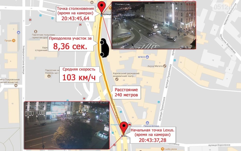 Время начальной точки: 20:43:37,28. В момент столкновения на камере отображается 20:43:45. Смена 44-й секунды на 45-ю происходит на 16 кадров ранее. То есть время столкновения: 20:43:45,64. Следовательно, Lexus преодолел рассматриваемый участок за 45,64 - 37,28 = 8,36 секунд. Измерив на карте пройденное расстояние - 240 метров, получим среднюю скорость: 240/8,36 = 28,7 м/с, что соответствует 103 км/ч. Учитывая, что перед столкновением Lexus несколько замедлился (судя по срабатыванию стоп-сигналов), максимальная скорость на данном участке была гораздо выше средней.
