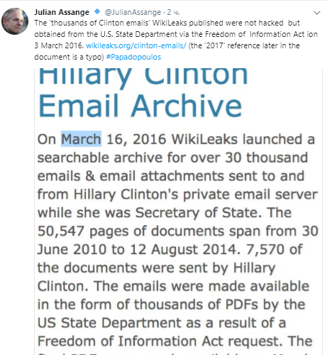 "Тысячи электронных сообщений Клинтон, опубликованные Wikileaks, не были взломаны, а получены в госдепе США на основе Закона о свободе информации 3 марта 2016 года", - заявил Ассанж в Twitter.