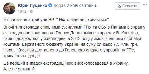 "Ночью 1 ноября совместными усилиями ГПУ и СБУ из Панамы в Украину экстрадирован бывший председатель Госинвестпроекта В. Каськив, который подозревается в завладении в 2012 году в сговоре с другими лицами средствами Государственного бюджета Украины на сумму около 7 500 000 грн. Сейчас Каськив доставлен в Главное следственное управление ГПУ, проводятся следственные действия", - написал Юрий Луценко.
