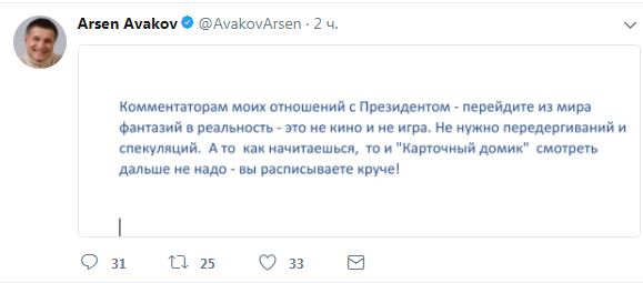 "Комментаторам моих отношений с президентом - перейдите из мира фантазий в реальность - это не кино и не игра. Не нужно передергиваний и спекуляций. А то, как начитаешься, то и "Карточный домик" смотреть дальше не надо - вы расписываете круче", - написал министр.