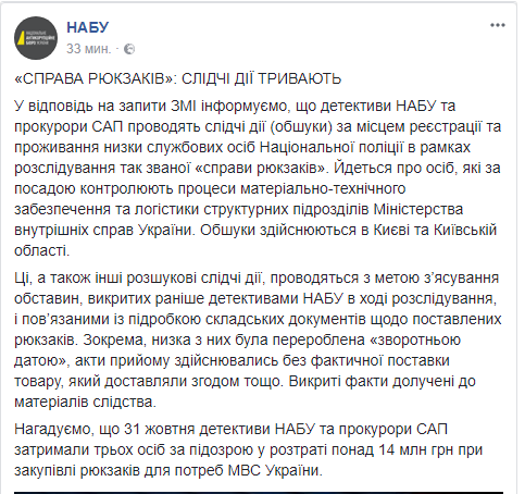 "Эти, а также другие поисковые следственные действия, проводимые с целью выяснения обстоятельств, уличенных ранее детективами НАБУ в ходе расследования, и связанными с подделкой складских документов по поставленным рюкзакам. В частности, ряд из них была переделана "обратной датой", акты приема осуществлялись без фактической поставки товара, который доставляли позже и тому подобное. Разоблаченные факты приобщены к материалам следствия", - отметили в НАБУ.