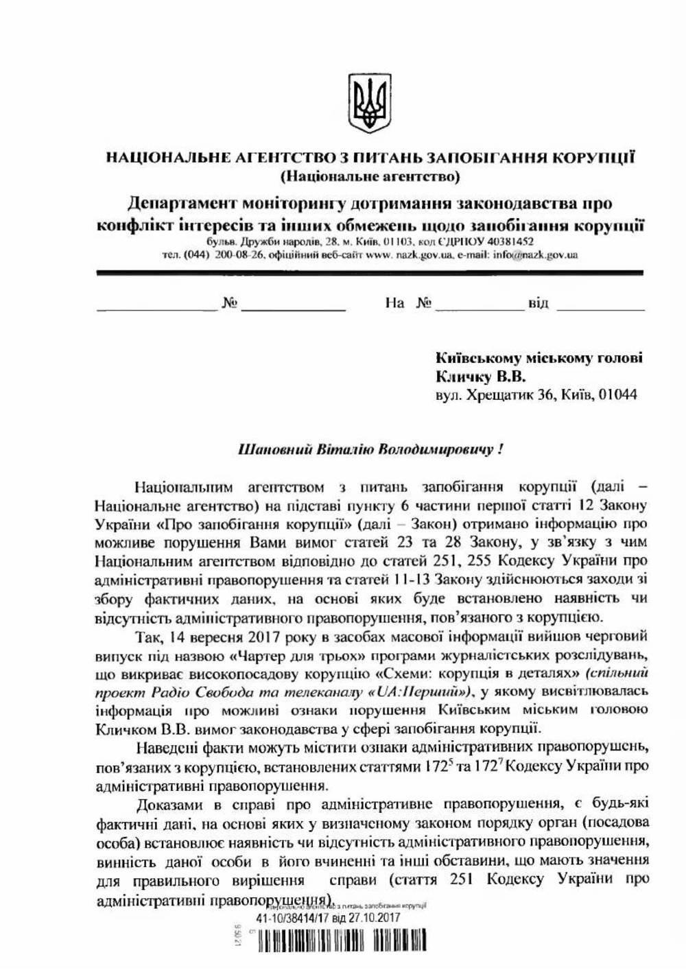 Национальное агенство по противодействию коррупции (НАПК) начало сбор данных касательно возможной коррупции мэра Киева Виталия Кличко. Об этом градоначальнику сообщили в официальном уведомлении, которое оказалось в распоряжении "Страны".