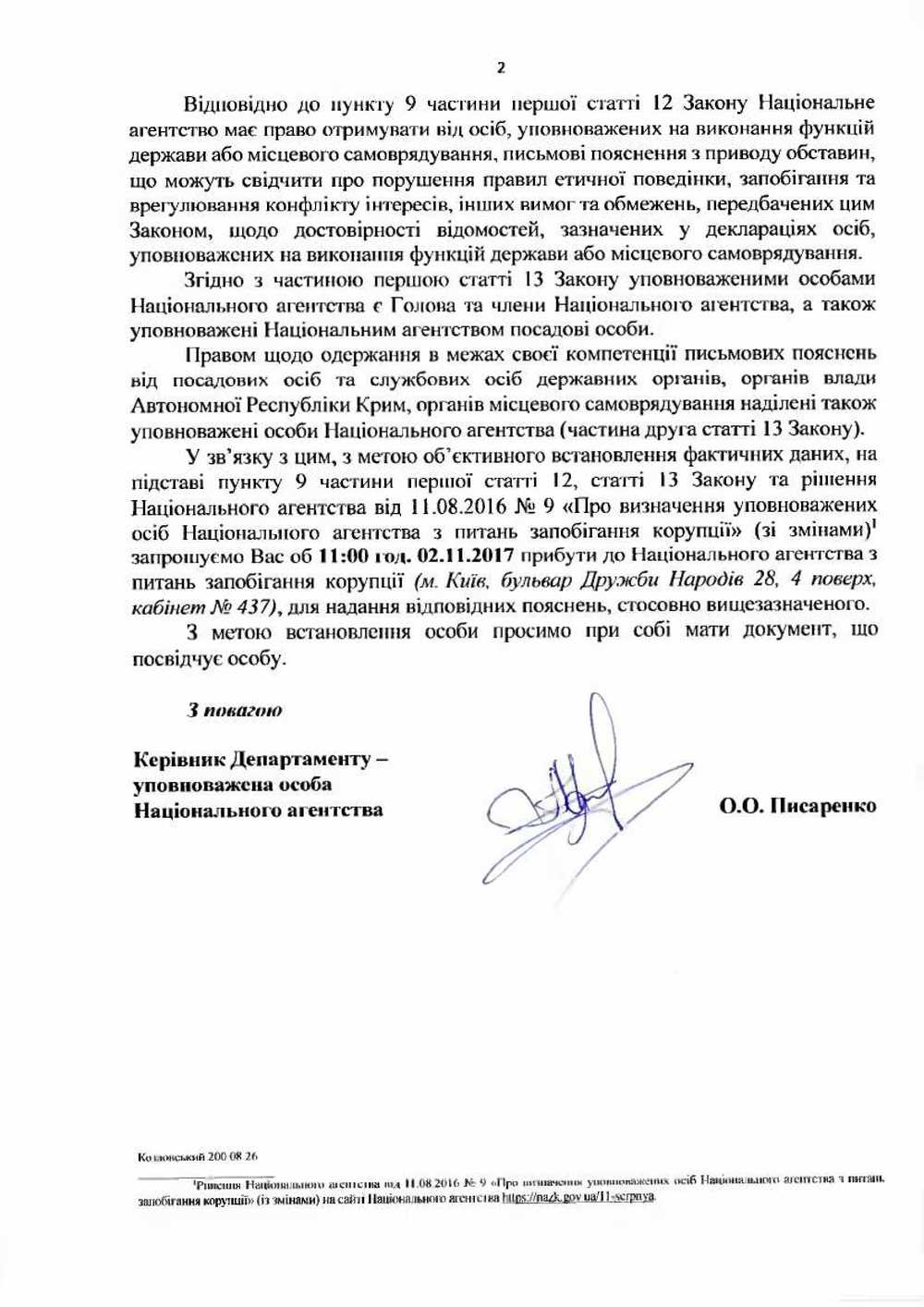 Его приглашают прийти завтра, 2 ноября, на 11:00 на допрос в НАБУ и дать пояснения.