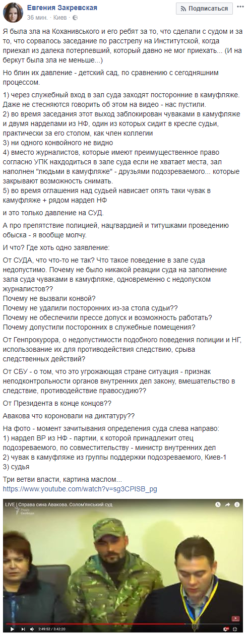 Политическое давление на Соломенский суд, который огласил меру пресечения сыну министра МВД Александру Авакову, адвокат Евгения Закревская назвала беспрецедентным. Свое мнение она пояснила на своей странице в Facebook.