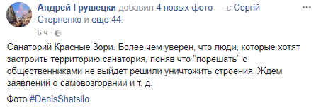 Представитель организации "Национальное сопротивление" Андрей Грушецкий выдвинул одну из версий причин возгорания: "Более чем уверен, что люди, которые хотят застроить территорию санатория, поняв что "порешать" с общественниками не выйдет решили уничтожить строения. Ждем заявлений о самовозгорании и т. д", - написал он.