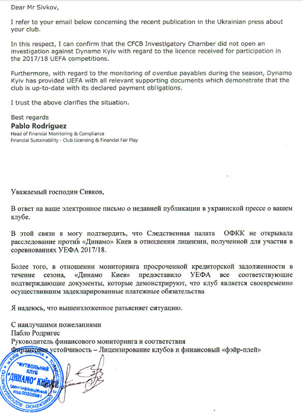 19.15 Накануне матча разразился скандал. В ФФУ заявили, что УЕФА, якобы, может снять Динамо с Лиги Европы из-за финансовых проблем. Но руководство клуба категорически опровергло эту информацию и привело официальный ответ из УЕФА.