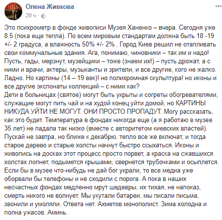 "По всем мировым стандартам должна быть +18...+19 плюс-минус 2 градуса, а влажность 50%, плюс минус 2%. Город Киев решил не отапливать свои коммунальные здания. Ага, понимаю, чиновники – так им и надо! Пусть, гады, мерзнут, музейщики – тоже (знаем их!) – пусть дрожат, а с ними и врачи, актеры, музыканты и зрители, и все другие, кого не жалко. Ладно. Но картины (14 – 19 век)! но полихромная скульптура! но иконы и все другие экспонаты коллекций – с ними как?", - написала Живкова.