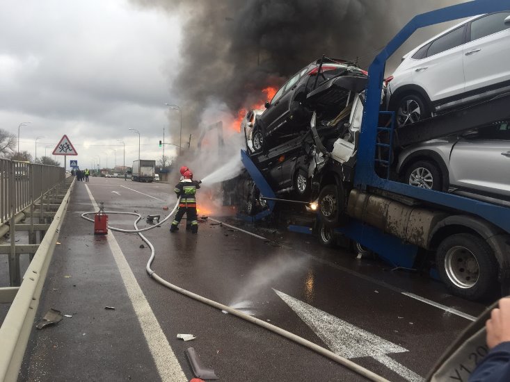 В результате столкновения, у одного из грузовиков загорелся салон кабины, с последующим распространением пламени на легковушки.