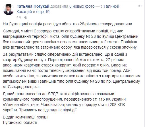 "Сегодня в Северодонецке сотрудниками полиции во время отработки территории города, возле дома № 28 по улице Центральной, был обнаружен труп мужчины с признаками насильственной смерти. Полицией уже установлено и задержано лицо, подозреваемое в совершении преступления", - написала она.