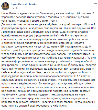 "Несколько представителей неправительственных организаций и просто граждан, которые приходили на встречу ко мне в Верховную Раду, пожаловались, что их личные вещи и сумочки принудительно осматривали неизвестные люди в балаклавах в устроенном у ВР самопостроенном вольере. Это недопустимо. И является серьезным нарушением закона, на который должна реагировать Нацполиция", - написала Геращенко.