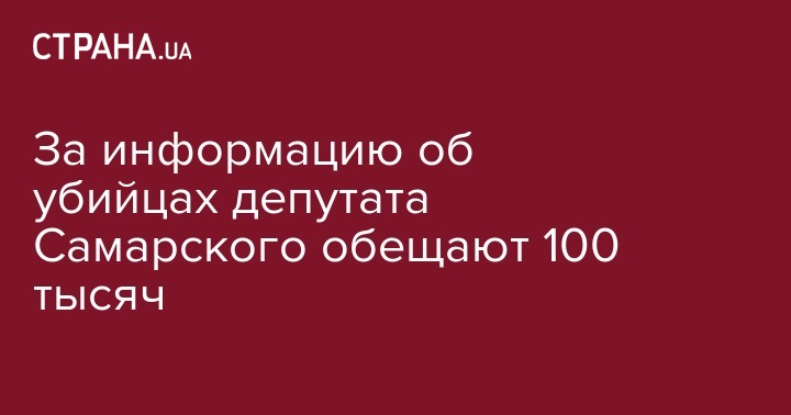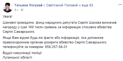 В Нацполиции обещают заплатить 100 тысяч гривен тому, кто предоставит информацию, чтобы раскрыть убийство депутата Северодонецкого горсовета Сергея Самарского. Об этом сообщила начальник отдела по связям с общественностью ГУ Нацполиции Украины в Луганской области Татьяна Погукай на своей странице в Facebook.
