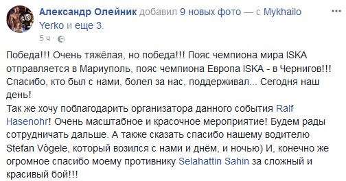 "Победа! Очень тяжелая, но победа! Спасибо всем, кто был с нами, болел за нас, поддерживал ... Сегодня наш день! "- написал Олейник.