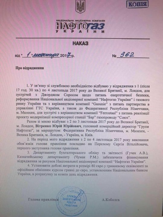 Глава "Нафтогаза" Андрей Коболев провел первые дни ноября в Лондоне, где обсуждал с миллиардером Джорджем Cоросом энергетическую безопасность и реформирование "Нафтогаза", а с руководством компании Gasunie партнерство в управлении газотранспортной системы Украины. Приказ о командировке публикуют "Украинские новости".