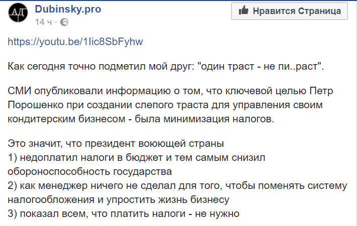 3) показал всем, что платить налоги - не нужно", - написал Дубинский в Facebook.