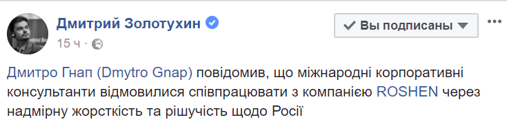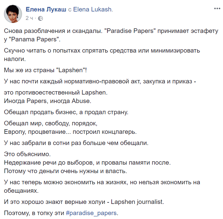 "Порохоботы активно отрабатывают офшорный скандал. По тупым темникам. Мол, Порошенко такой патриот супер-пупер, что Appleby типа побоялись русских, поэтому офшор не открыли. Бред самой сивой кобылы. Для нормальных людей объясняю: сейчас все, кто открывает счет в западном банке подписывает отдельную форму, что он не является PEP (Politically Exposed Person). От таких с приставкой все шарахаются, как от огня уже года четыре. Респектабельные компании с PEP-ами стараются вообще не работать. Себе дороже. А порохоботам нравится", - пишет в Facebook заместитель главного редактора "Страны" Светлана Крюкова.