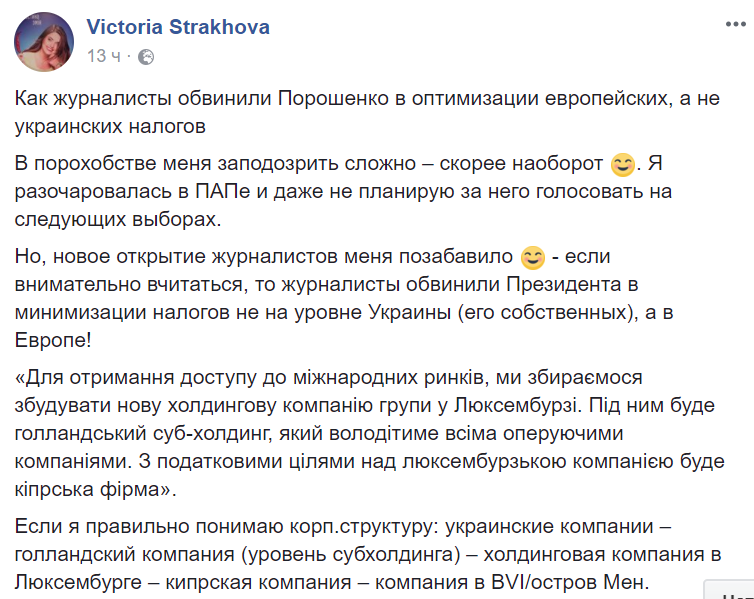 "Если внимательно вчитаться, то журналисты обвинили Президента в минимизации налогов не на уровне Украины (его собственных), а в Европе!", - написала Страхова в Facebook, сделав предупреждение, что "я не порохобот".