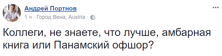 "Коллеги, не знаете, что лучше, амбарная книга или Панамский офшор?", - спрашивает юрист Андрей Портнов.