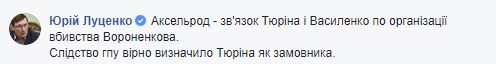 В комментариях к посту Мосийчука отметился генеральный прокурор Украины Юрий Луценко. Он написал о том, что Аксельрод "засветился" в деле об убийстве в Киеве российского экс-депутата Госдумы Дениса Вороненкова. "Аксельрод - связь Тюрина и Василенко по организации убийства Вороненкова. Следствие ГПУ верно определило Тюрина как заказчика", - написал генпрокурор.