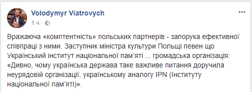 "Заместитель министра культуры Польши уверен, что Украинский институт национальной памяти... общественная организация: "Странно, почему украинское государство такой важный вопрос поручило неправительственной организации, украинскому аналогу IPN (Институт национальной памяти)", – написал Вятрович в Facebook.