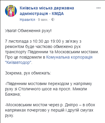 7 ноября с 10:30 до 19:00 в связи с ремонтом будет частично ограничено движение транспорта Южным и Московским мостами. Об этом сообщили в Киевской администрацию, ссылаясь на данные Коммунальной корпорацим "Киевавтодор". В частности, движение ограничат: