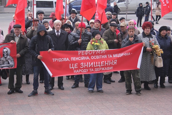 В Кропивницком колонна активистов КПУ с революционными песнями, плакатами, транспарантами и флагами прошла по главной улице к площади перед городским советом, где состоялся митинг.