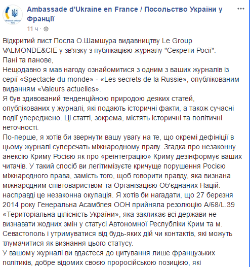 Посол Украины во Франции Олег Шамшур написал открытое письмо французскому издательству Le Group VALMONDE & CIE в связи с публикацией журнала "Секреты России".