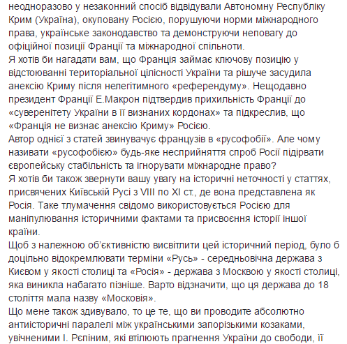 "Я хотел бы также обратить ваше внимание на исторические неточности в статьях, посвященных Киевской Руси с VIII по XI в., Где она представлена ​​как Россия. Такое толкование сознательно используется Россией для манипулирования историческими фактами и присвоения истории другой страны. Чтобы с должной объективностью осветить этот исторический период, было бы целесообразно отделять термин "Русь" - средневековое государство с Киевом в качестве столицы и "Россия" - государство с Москвой в качестве столицы, которое возникло гораздо позже. Стоит отметить, что это государство до 18 столетия называлось "Московия", - говорится в письме.