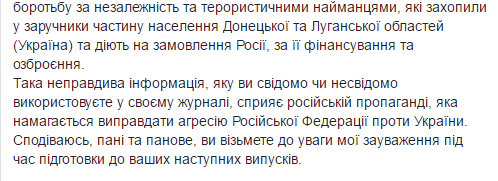 "Во-первых, я хотел бы обратить ваше внимание на то, что отдельные дефиниции в этом журнале противоречат международному праву. Упоминание о незаконной аннексии Крыма Россией как о "реинтеграции" Крыма дезинформирует ваших читателей. Таким образом вы легитимизируете вопиющее нарушение Россией международного права вместо того, чтобы говорить правду, которая признана международным сообществом и Организацией Объединенных Наций: на самом деле это незаконная оккупация. Я хотел бы напомнить, что 27 марта 2014 Генеральная Ассамблея ООН приняла резолюцию A/68/L.39 "Территориальная целостность Украины", которая призывает все государства не признавать никаких изменений в статусе Автономной Республики Крым и г.. Севастополь и воздерживаться от любых действий или контактов, которые могут толковаться как признание этого статуса", - говорится в письме.