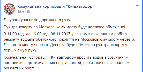 "С 11:00 до 16:00  08.11.2017 в связи с выполнением работ по ремонту асфальтобетонного покрытия на Московском мосту через р. Днепр и мосту через р. Десенка будет ограничено движение транспорта в первой полосе движения", – говорится в сообщении.