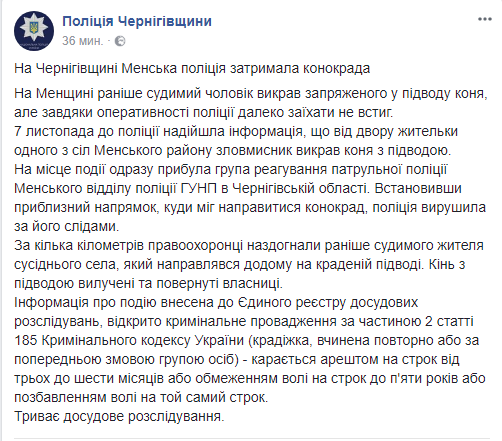 В Черниговской области ранее судимый мужчина похитил запряженную в телегу лошадь, но быстро попался в руки полиции. Об этом сообщает пресс-служба местных копов в Facebook.