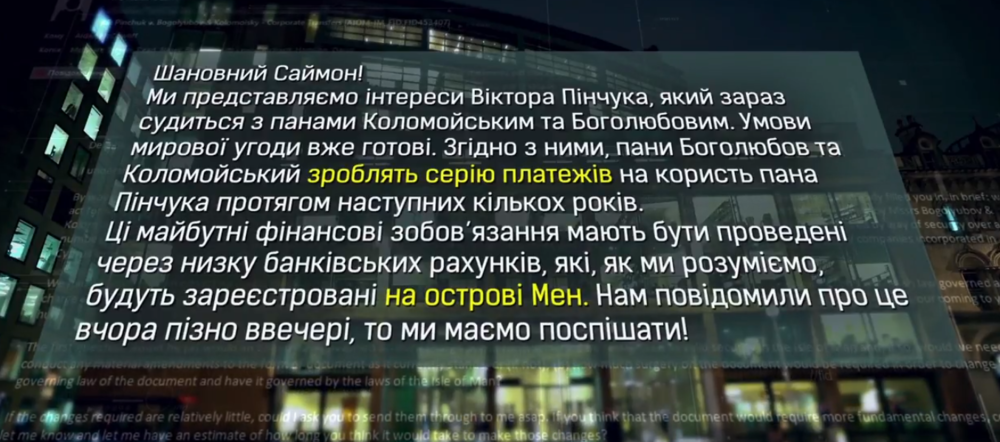 О том, что Пинчук и Коломойский договорились, говорится в письме британских юристов Пинчука из фирмы Hogan Lovells в адрес офшорных консультантов Appleby. Оно поступило туда в январе, за несколько дней до судебного урегулирования.