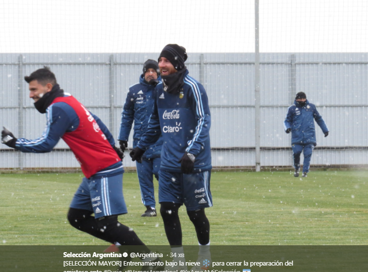Во вторник 10 ноября подопечные Хорхе Сампаоли провели тренировку, участие в которой принял и звездный Лионель Месси. Несмотря на то что шел снег, занятие прошло по плану. Об этом сообщается на официальной странице аргентинской сборной в Twitter.