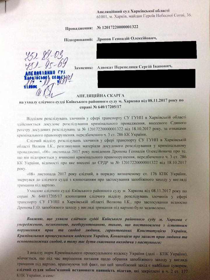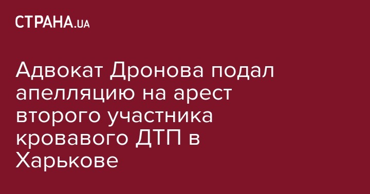 Защитник водителя Volkswagen Touareg Геннадия Дронова, второго подозреваемого в ДТП на пересечении улицы Сумской и переулка Мечникова, обжалует определение Киевского райсуда об избрании меры пресечения - аресте. Апелляционную жалобу адвокат Дронова Сергей Перепелица подал сегодня, это  он сообщил "МедиаПорту".