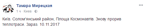 "Киев. Соломенский район, Площадь Космонавтов. Снова прорыв теплотрассы. Сейчас. 10.11.2017", - говорится в ее сообщении.