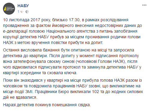 "10 ноября 2017 года в рамках расследования производства по факту вероятного внесения недостоверных данных в е-декларацию главой Национального агентства по вопросам предотвращения коррупции, детектив НАБУ прибыл по месту жительства родственницы главы НАПК с целью вручения повестки прибыть на допрос", – говорится в сообщении.