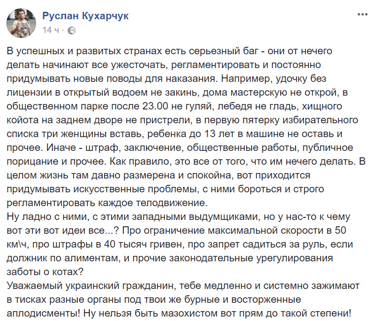 "Любая, абсолютно любая громкая трагедия будет использована любым государством как предлог для усиления своего репрессивного карательного права. Это не только в Украине так, но так досадно, что и в Украине тоже", - написал Кухарчук у себя в Facebook.