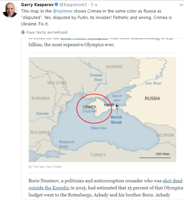 "Эта карта в NYTimes изображает Крым в том же цвете, что и Россия, как "спорную" территорию. Спорная с точки зрения Путина, из-за его захвата! Печально и неправильно. Крым – это Украина. Исправьте это", – написал он.