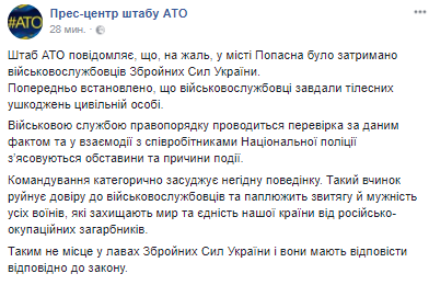 "Штаб АТО сообщает, что, к сожалению, в городе Попасная задержали военнослужащих Вооруженных сил Украины. Предварительно установлено, что военнослужащие нанесли телесные повреждения гражданскому лицу", - говорится в сообщении.
