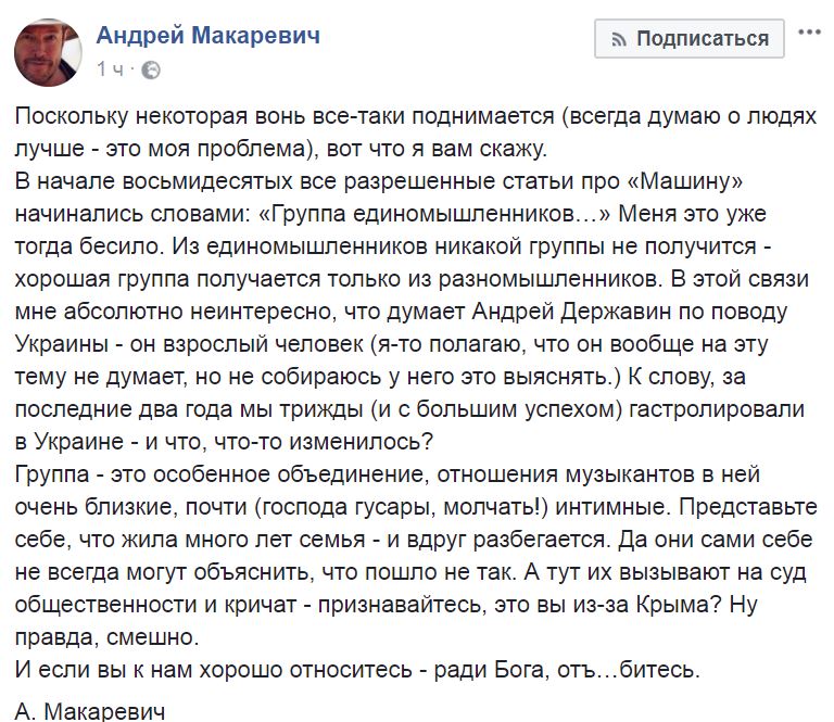 "В начале восьмидесятых все разрешенные статьи про "Машину" начинались словами: "Группа единомышленников…" Меня это уже тогда бесило. Из единомышленников никакой группы не получится - хорошая группа получается только из разномышленников. В этой связи мне абсолютно неинтересно, что думает Андрей Державин по поводу Украины - он взрослый человек (я-то полагаю, что он вообще на эту тему не думает, но не собираюсь у него это выяснять.) К слову, за последние два года мы трижды (и с большим успехом) гастролировали в Украине - и что, что-то изменилось?", - пишет музыкант.